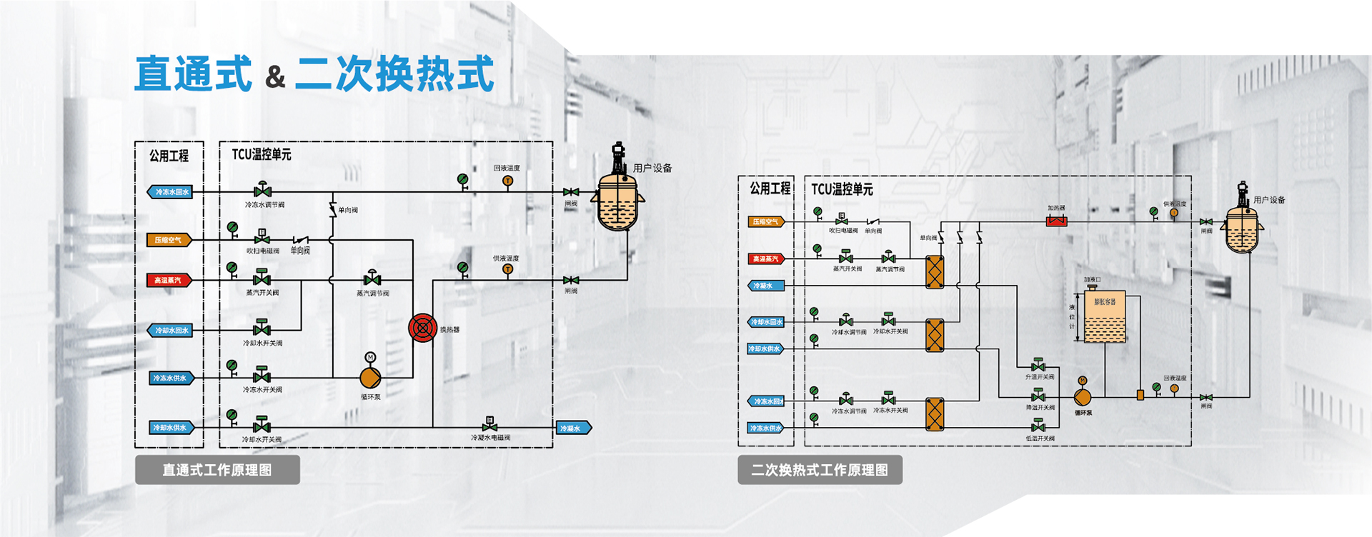 1.传热介质循环:将传热介质从储罐中抽取出来,并通过管道送往被控对象。传热介质在被控对象内部传递热量,并将其带回TCU系统进行再次加热或冷却。